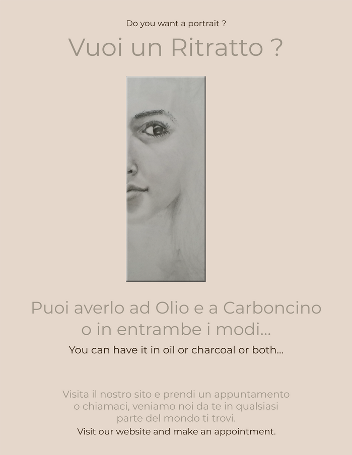 Vuoi un Ritratto? E' possibile averlo dal formato 50 x 70 in poi, su Tela o Cartoncino e puoi scegliere se farlo a Carboncino ad Olio o in entrambe i modi. Chiamaci o Scrivici per prendere appuntamento e sapere le modalità, veniamo noi da voi, in qualsiasi parte del Mondo voi siate.